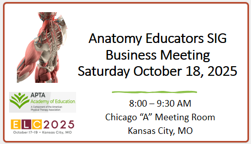 As we prepare for the Education Leadership Conference (ELC) in Kansas City, we want to bring together the APTA Education Academy’s Anatomy Educators SIG to explore opportunities for research collaboration. During our SIG meeting, we plan to highlight different research projects looking for potential collaborators and discuss ideas for future studies that could benefit from broader involvement.