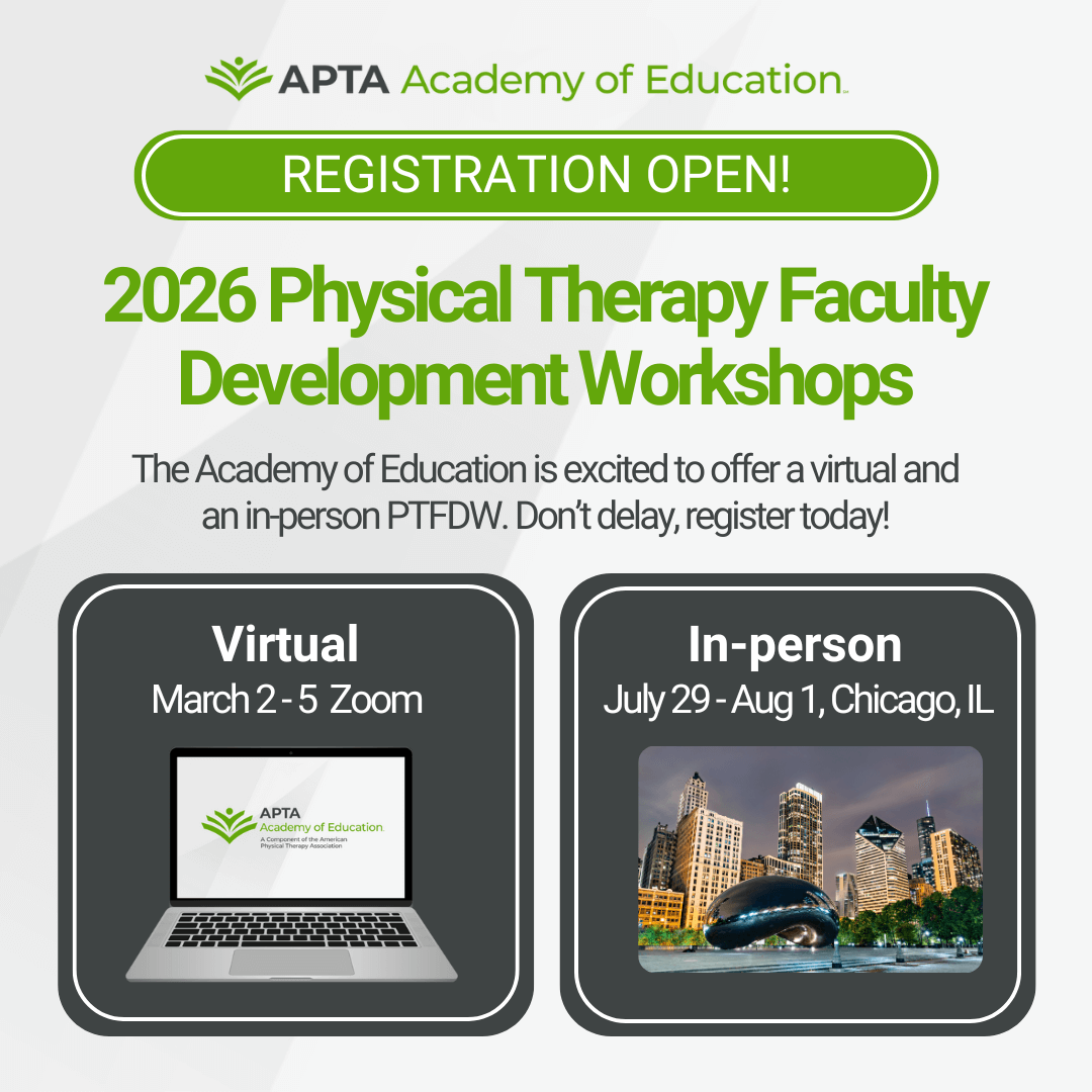 The APTA Academy of Education is dedicated to the development of each new generation of physical therapy practitioners, a dynamic cadre of academic educators, and a store of knowledge useful to consumers for enhancing their own musculoskeletal health.